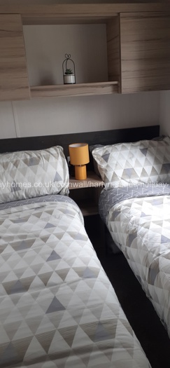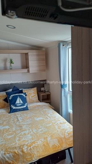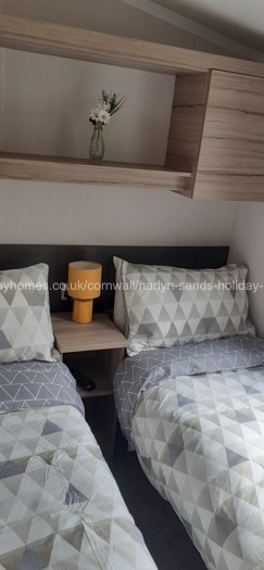 Our double glazed at central heated caravan at Harlyn Sands Holiday Park, has three bedrooms, one double with TV and two twin bedded rooms, one with TV. Each bedroom has plenty of storage space and hangers. There’s also a hairdryer provided.