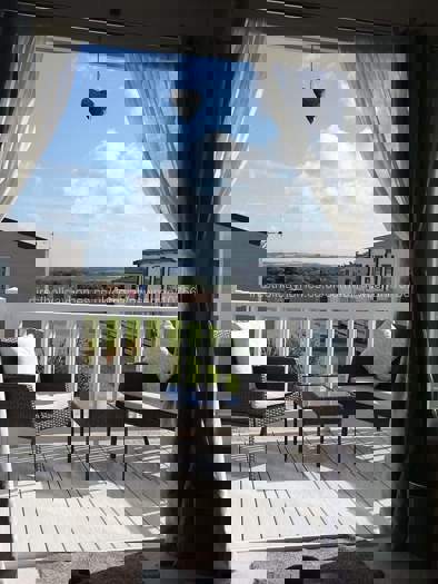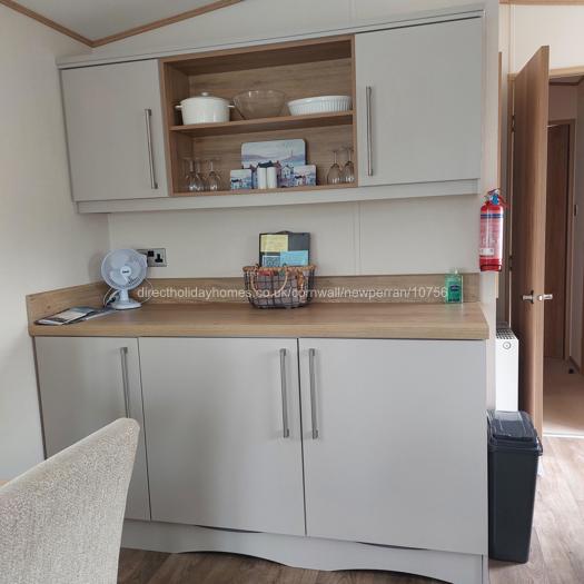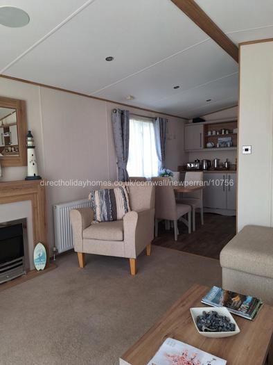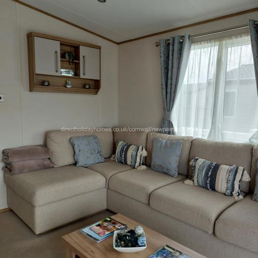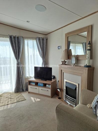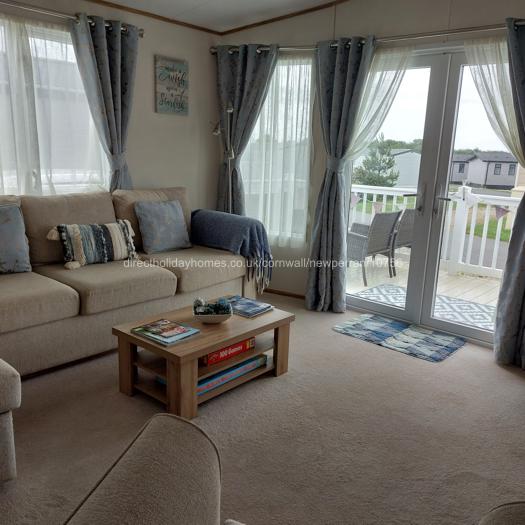 Within the living area of our Newperran caravan, you will find an electric fire, TV with surround sound, Wi-Fi and patio doors opening directly onto the decking area.