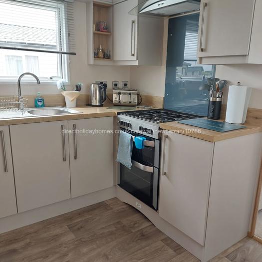 The open plan. well equipped kitchen has a gas oven/hob, a microwave, air fryer, under counter fridge and freezer, along with a dining area.