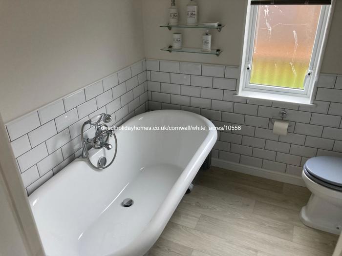 From the guest bedroom we cross into the family bathroom which has a full sized roll top bath with shower over, wash basin pedestal and a WC. This is a huge family bathroom.