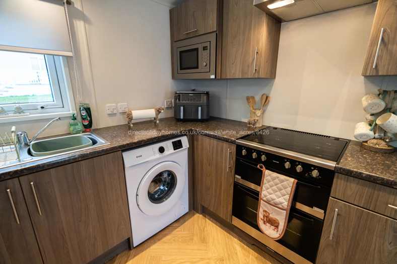 The modern kitchen is fully equipped for proper cooking, including an oven, hob, washing machine, fridge / freezer and an air fryer.