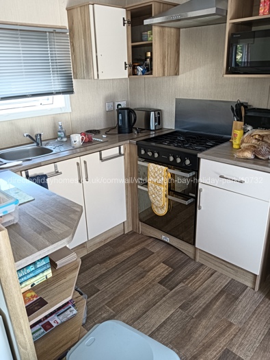Within the kitchen is a large fridge freezer, gas oven, four ring gas hob, a microwave, cooker extractor fan, kettle, 4 slice toaster and a variety of pans, crockery, cutlery and utensils. There’s also plenty of storage for groceries.