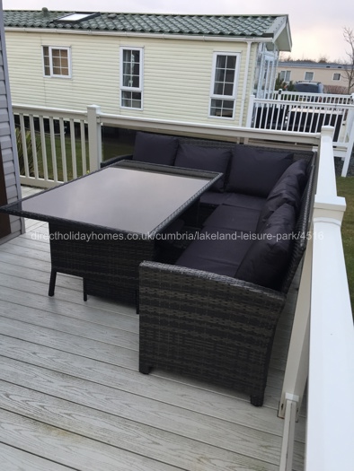 The caravan has a very large wrap-around veranda/decking area complete with a large corner rattan sofa with dining table and sun shade looking out towards the lake. The veranda is gated and very safe for the little ones to play on.