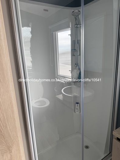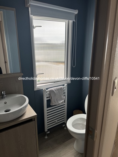 Bathroom - Fully fitted double shower with glass sliding door, toilet, and wash basin. It is very spacious with storage, heated towel rail and a mirror.