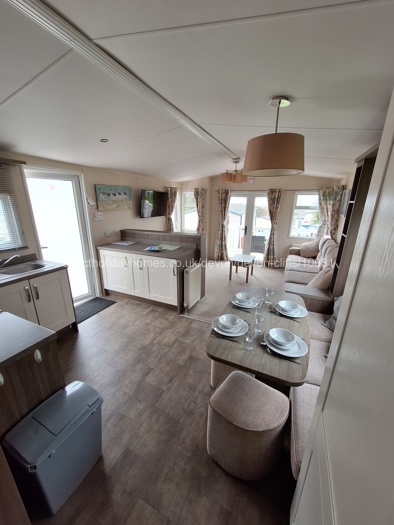 The inside layout boasts an ample size open plan living area and kitchen, with a layout that differentiates itself from other caravans, providing zones for cooking, dining and relaxing.