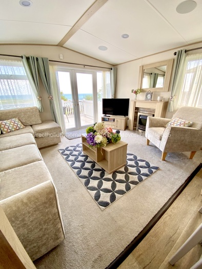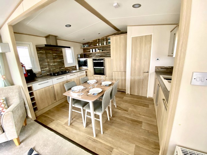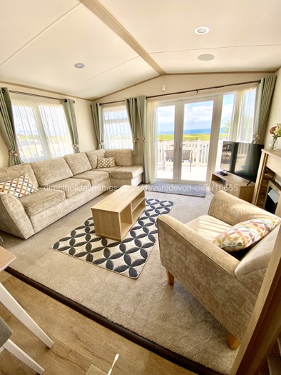 A key feature of this premium caravan is the large wraparound decking with wonderful views of the Jurassic Coast and English Channel. Sitting out here at the table and chairs does wonders for the soul!