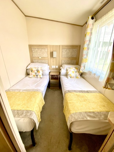 The first twin bedroom has full size single beds, a wall-mounted TV and wardrobe, while the second twin bedroom has smaller single beds and a wardrobe.