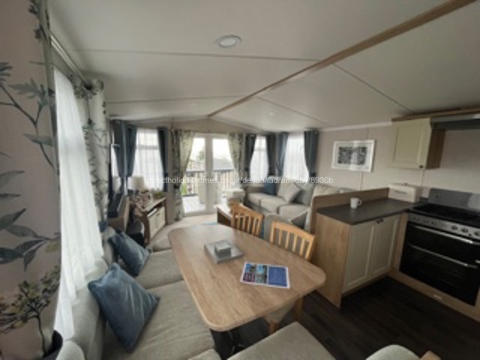 To the front of the caravan you will find the lounge, which features a built-in corner sofa area with soft furnishings, a coffee table, 40" LED TV with sound bar, Sky TV and a DVD player. Double doors open out onto a decking area overlooking the sea.