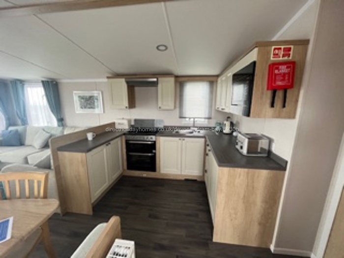 As you enter the holiday home, the kitchen is a modern design with built-in microwave and fridge freezer, along with gas oven and hob. Plenty of storage is available within the kitchen too. This is completed by a built-in dining seating area.