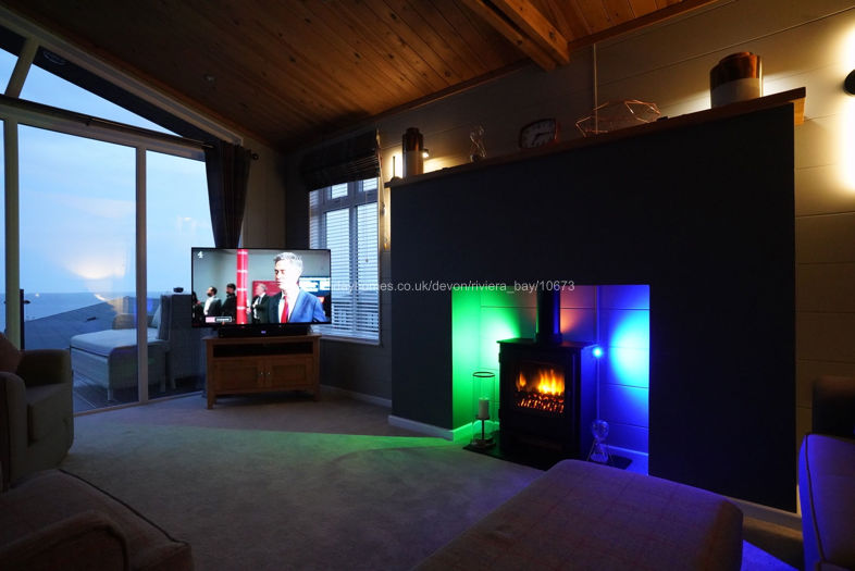 The extensive lounge area offers a comfy sofa with a further 2 free standing armchairs, coffee table with a feature fireplace with an electric log fire and a smart tv . Off the lounge there are floor to ceiling windows to admire the view, if you fancy some time relaxing, this is the perfect place to go.