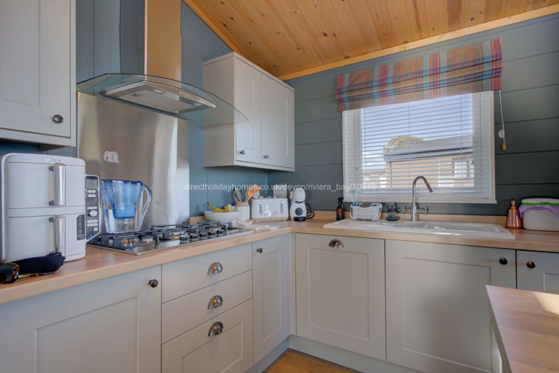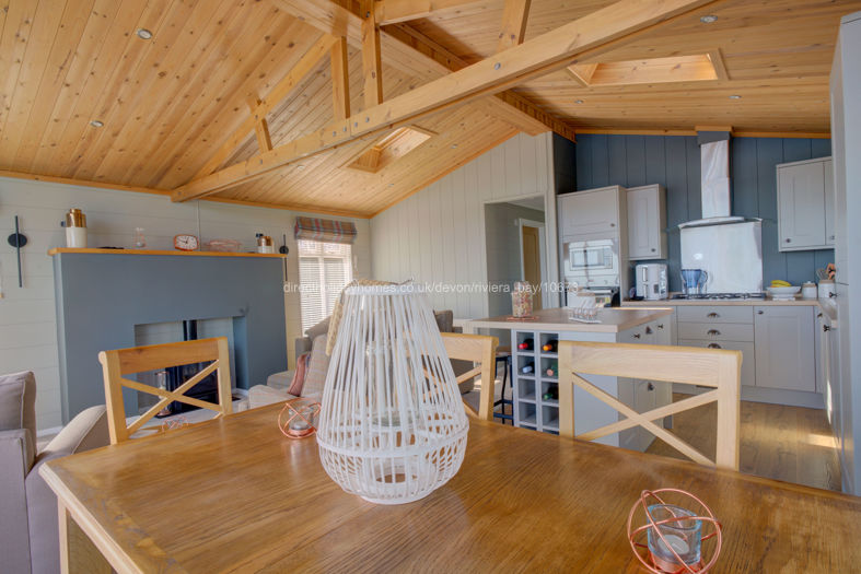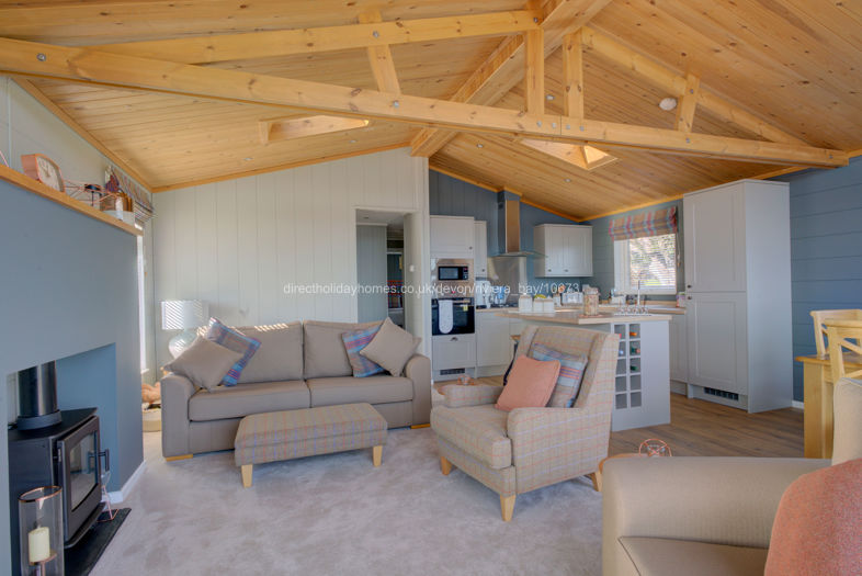 The lodge has a spacious open plan layout with kitchen and living area, complete with vaulted timber ceilings and exposed wooden beams. The large kitchen area to the front has a 6 seater dining table and chairs, along with an island with two stools. Within the kitchen there is a freestanding fridge-freezer, an integrated dishwasher, microwave, five burner hob and an oven/grill. We also have a Ninja air fryer and plenty of storage throughout.