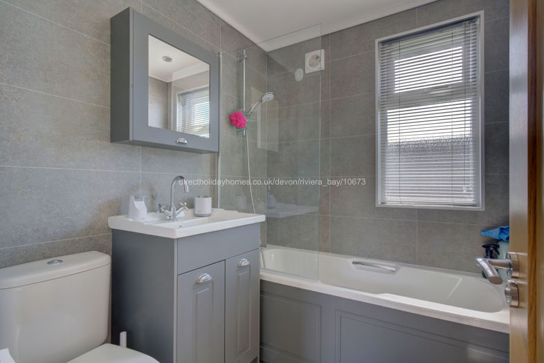 The family bathroom has a bath with overhead shower, a sink and toilet, along with plenty of storage. There is also a mirror with overhead lighting.