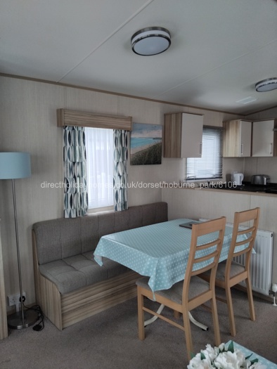 Spacious open plan living and dining area with frontal bay window and large seating area, electric fire, 29" LED TV, DVD player and DAB Radio. Dining area has table with bench style seating and 2 freestanding chairs and radiator.