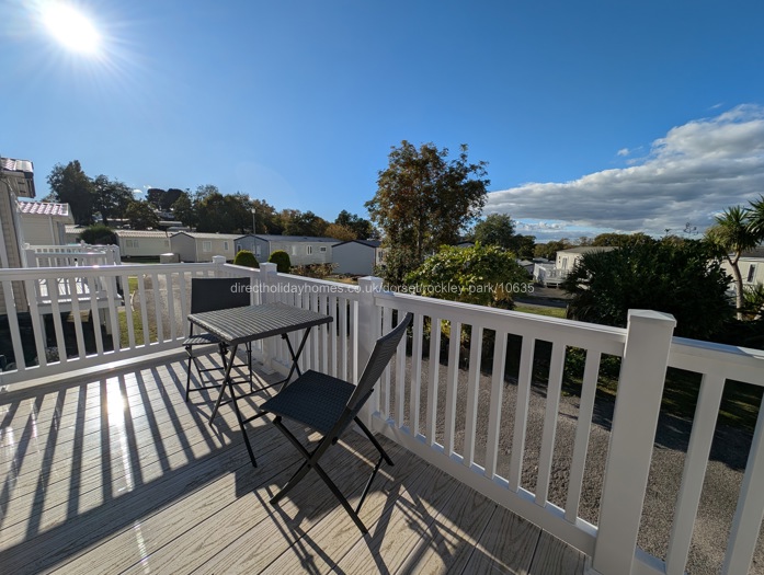 Outside, enjoy a veranda with decking, complete with table and chairs, plus a separate patio area and private parking for two cars right next to the caravan.