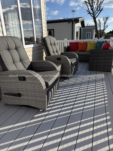 Unwind in the large open-plan lounge, complete with a plush L-shaped sofa that converts into a comfortable double bed, a 40” TV and double patio doors opening onto the extra-wide decking. Enjoy breathtaking views while lounging on the outdoor L-shaped seating or reclining in luxury deck chairs as the sun sets over the bay.