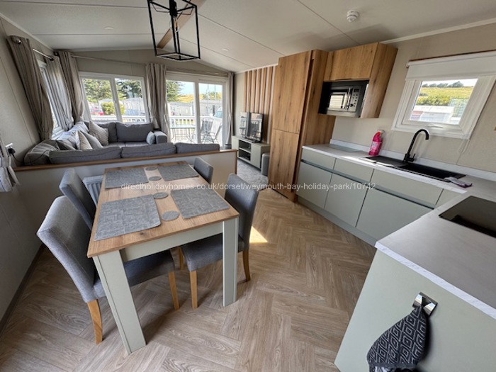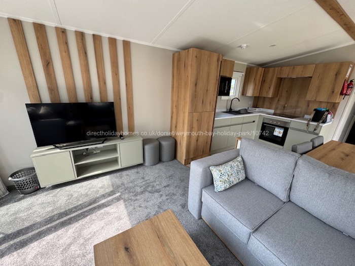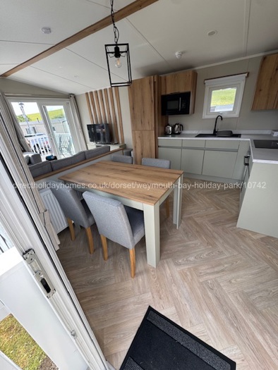 The living area has L shaped seating and is equipped with a TV with Freeview channels, a DVD player. The area is heated by radiators. To the front of the caravan are French doors that open onto a decked area with seating and lovely views across the site.