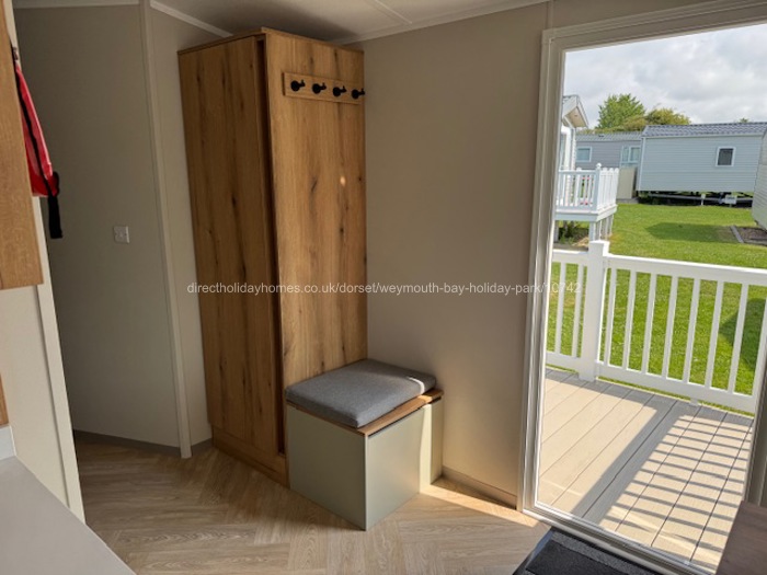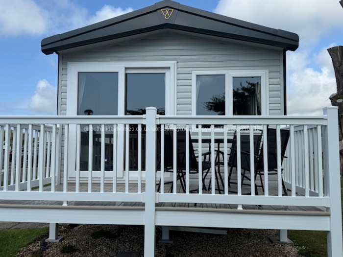 The decked area leads out from the French doors at the front of the caravan and is 12ft wide and 6ft out it has a patio dining set with table and 4 chairs. It also has a separate decking down the side of the caravan. It measure 6’ x 8’ across the side entrance of the caravan this area is also gated.