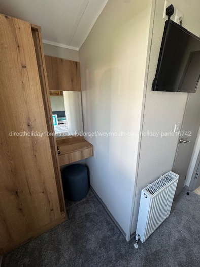 The master bedroom has bedside cabinets, overhead storage, wardrobe with drawers and a dressing table with stool. There is also a hairdryer for your use. The bed is a double. This room is heated by a radiator.