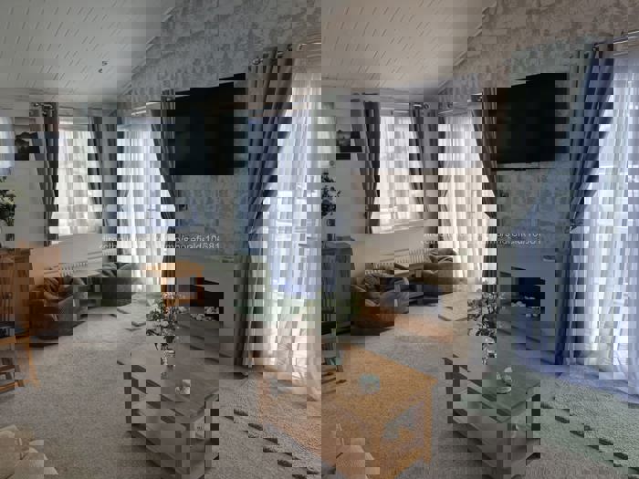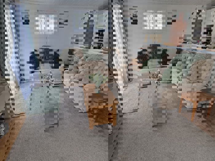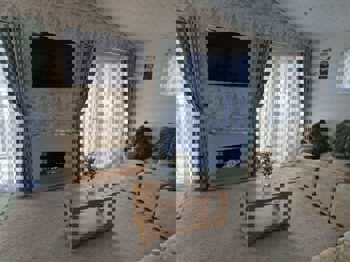 A cosy yet spacious lounge with a three-seater sofa, two comfortable reclining chairs, a wall-mounted 50" smart TV, and an electric fire for snug evenings in.