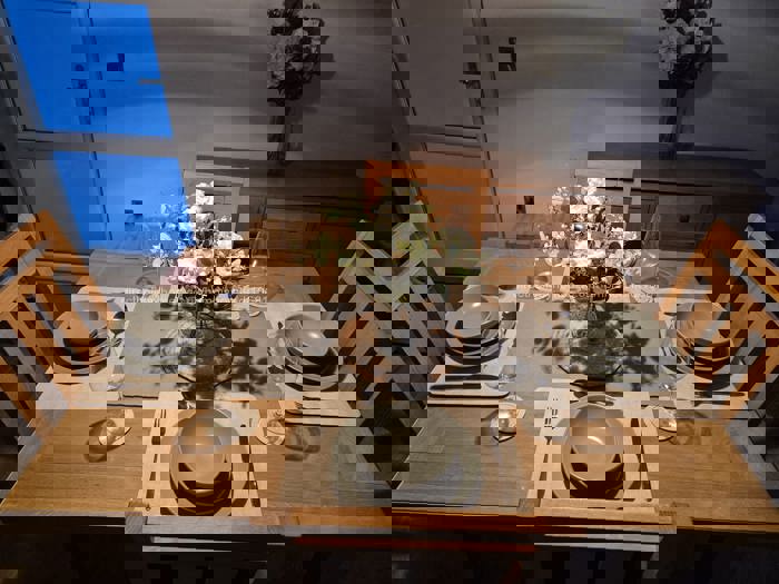 A beautiful dining area with seating for six at an extendable table - ideal for quality family meals or a romantic dinner for two.