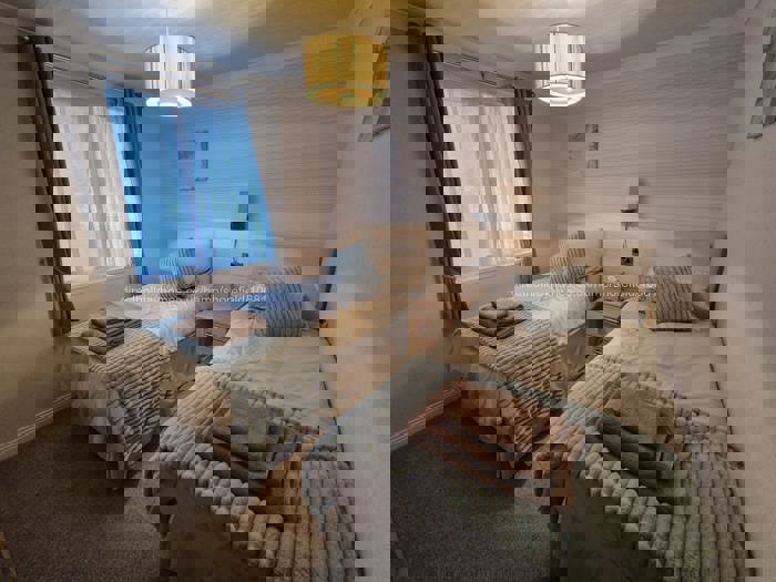 Bedroom 3: Twin room with two full-size 3ft single beds, bedside drawers, and a single wardrobe.