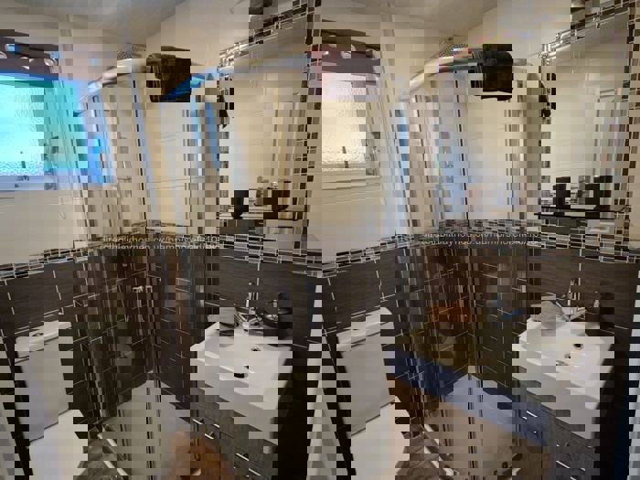 The main bathroom is spacious and modern, featuring a curved glass corner shower with twin sliding doors and a luxurious rainfall shower head.
