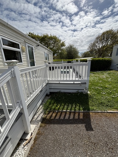 2 private car parking spaces are attached to our caravan leading to a sunny, south facing extra wide decking with gate, benefiting from a table and chairs for eating and relaxing. Perfect for dining al-fresco or enjoying a glass of your favourite tipple whilst watching the sun going down. Additional grassed area to the right of the decking in front of the parking spaces.