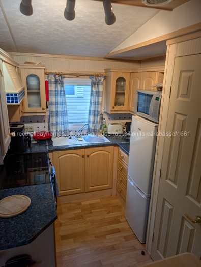 The mobile home is fully equipped and offers air conditioning, a fridge (with freezer compartment), full size gas cooker, a microwave and an air fryer.
