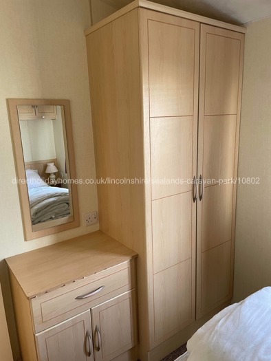 Our Sealands caravan has three bedrooms. The main bedroom has a double bed with shelves either side, over-bed cupboards, a wardrobe, drawers and a mirror. The other two bedrooms each have two single beds, over-bed cupboards, a small bedside cupboard with lamp, a wardrobe and mirror.