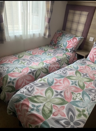 Bedroom 2 has two single beds with bedside cabinet with a lamp and power sockets. Single wardrobe, 24” tv with free view . Large mirror for doing hair and makeup, plus a centrally heated radiator.