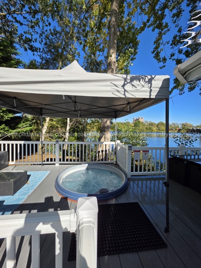 We have a wraparound, gated decking to ensure those little people and furry friends are safe. This is where you'll find the sunken hot tub and seating overlooking the Castle Lake.
