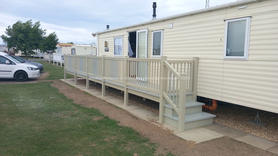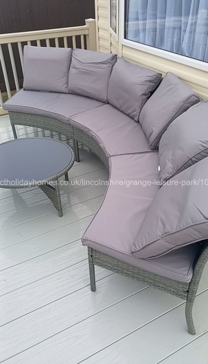 Our 2019 caravan for hire on The Grange Holiday Park, has a large decking area, complete with outside furniture.
