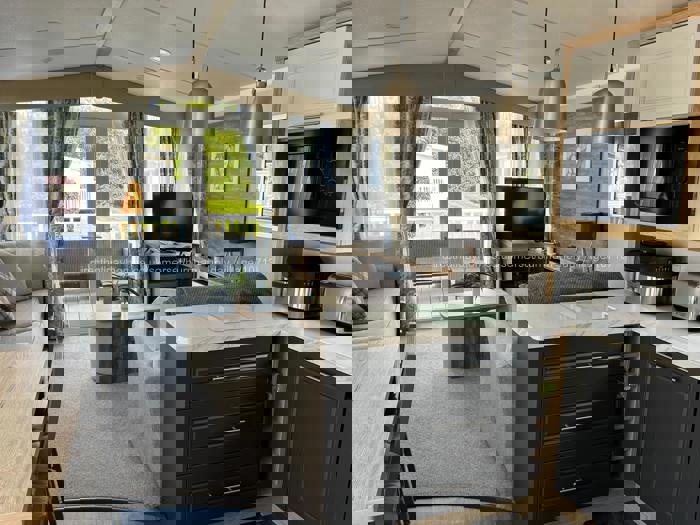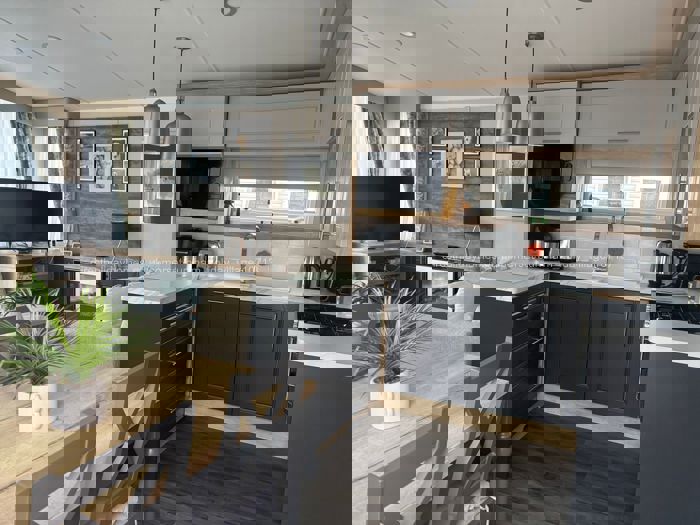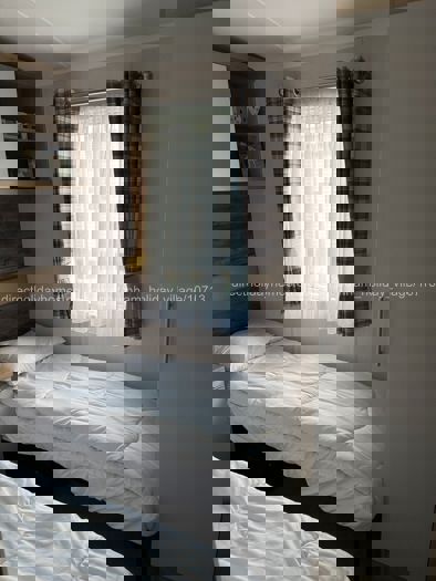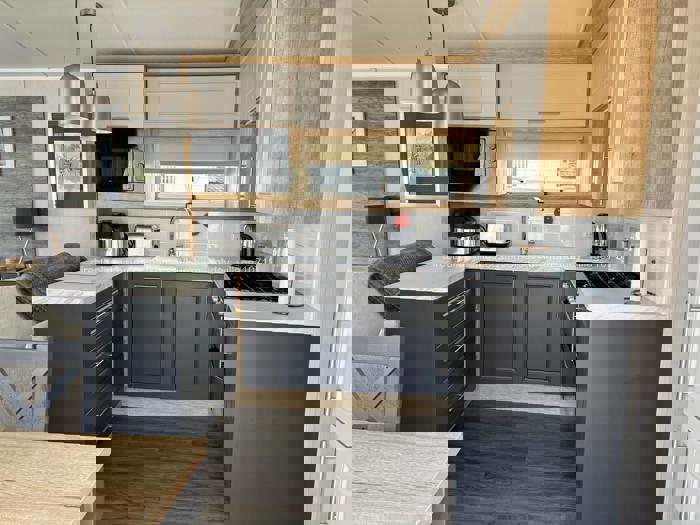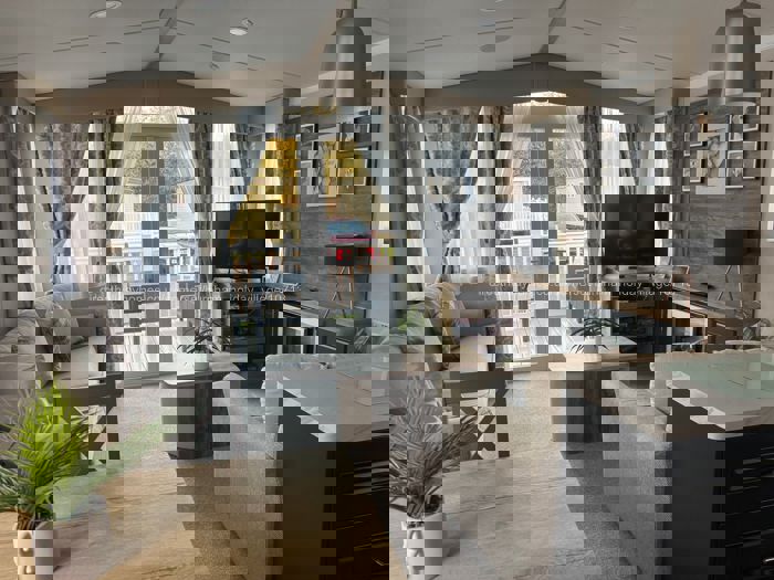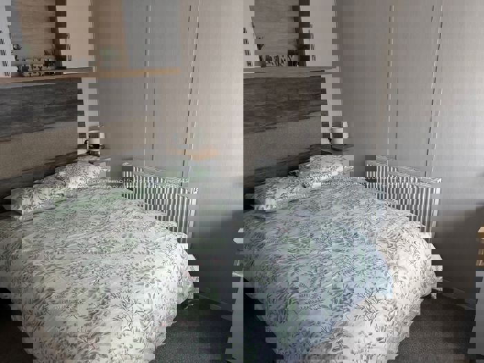 This 40’ x 12’ Swift Bordeaux Exclusive caravan at Burnham-on-Sea Holiday Village has three bedrooms and sleeps six guests. The main bedroom has a double bed and an en-suite, while the other two rooms each have two single beds.