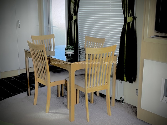 With French doors opening onto the veranda; a large four seater sofa and a single armchair; wooden dining table with four chairs; large 40” Freeview TV and DVD player; remote control flame-effect fire.