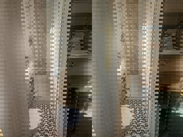 Main bedroom has a king size bed, TV and an en suite with toilet, sink and shower. There is also another bedroom with 2 single beds and a double sofa bed in the lounge