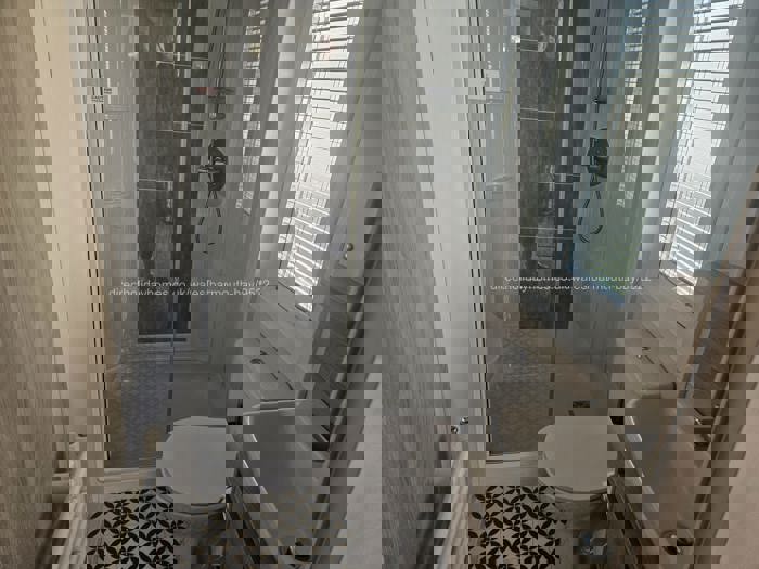 Main bathroom with shower, toilet and wash basin