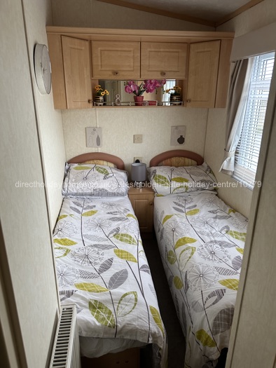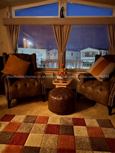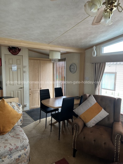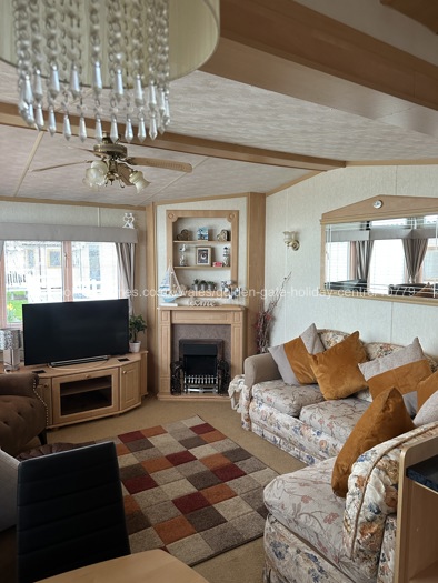 Three bedroom, 37' x 12', pet friendly caravan for hire at Golden Gate Holiday Centre in Towyn, situated on a prime end plot with parking for two cars.