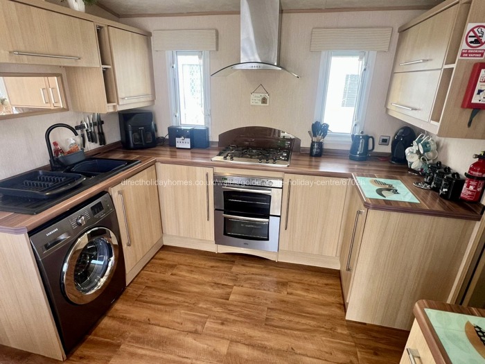 The kitchen is well equipped & has an abundance of storage and work space, it has a large integrated fridge/freezer, washing machine, air fryer, slow cooker, electric steamer, coffee machine, plus all the usual kitchenware.