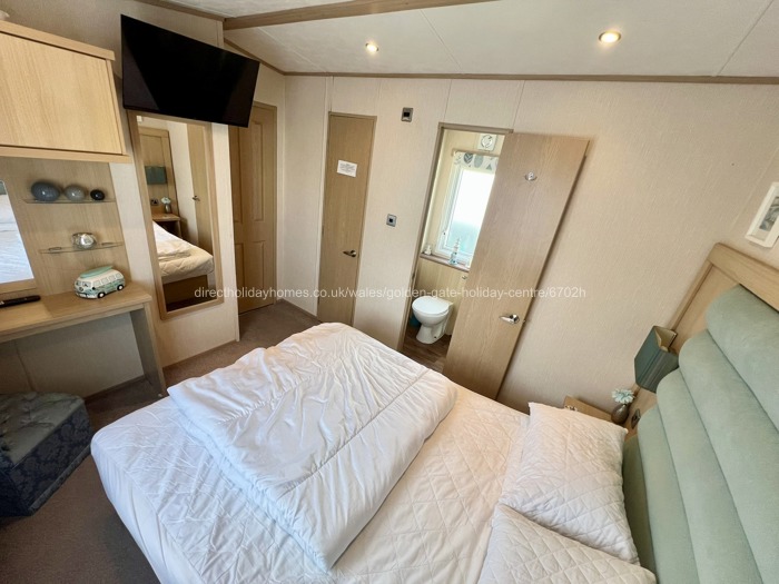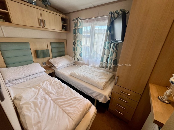 The twin bedroom has 2 single beds, plenty of storage plus wall mounted tv.
