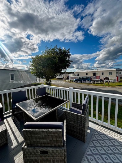 The caravan has a secure side decking with rattan table and chairs, with cushions.