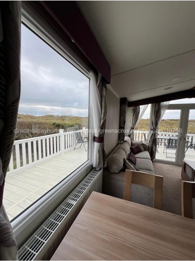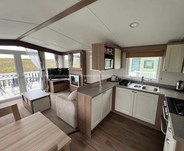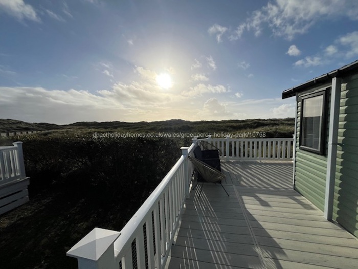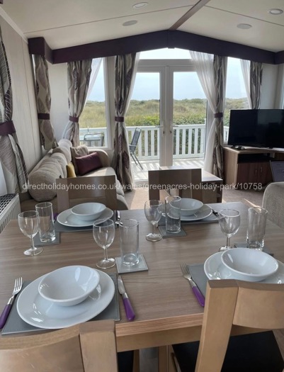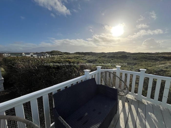 Double doors lead out onto the decking area which has a table and chairs. The UPVC decking wraps around the caravan to the side door, and has a gate. It also offers beautiful views to the rear.