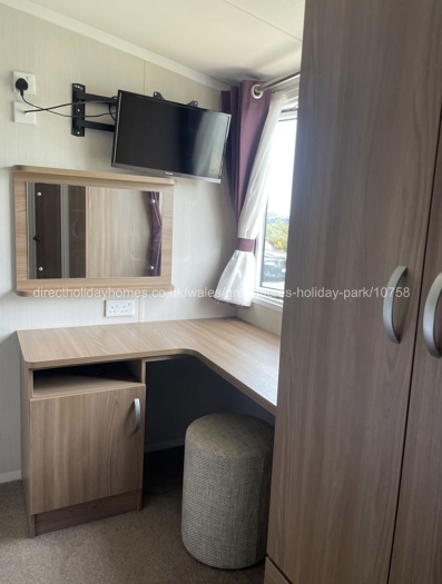 The double bedroom has a double bed, wardrobe, overhead and floor level storage, a dressing table with mirror and a 24” HD Smart LED TV. It also features an en-suite toilet with hand basin.