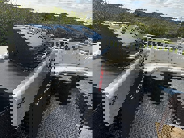 A full wrap around balcony with BBQ, pizza oven, fire pit, wrap around decking, outside dining table and chairs and a large outside sofa that can be turned into a large daybed.
