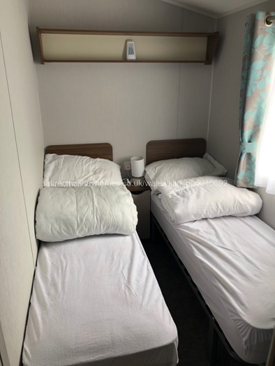 It has 3 bedrooms; one double bedroom with full size double bed and two twin bedrooms, each with two small single beds. All bedrooms have a wardrobe and hooks for hanging clothes.