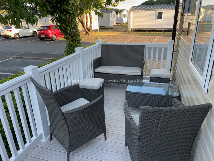 Outside, leading up to the caravan door, is a ramp and small decking area, with a patio furniture set. At the bottom of the ramp is a small patio area with a hedge and flower borders.