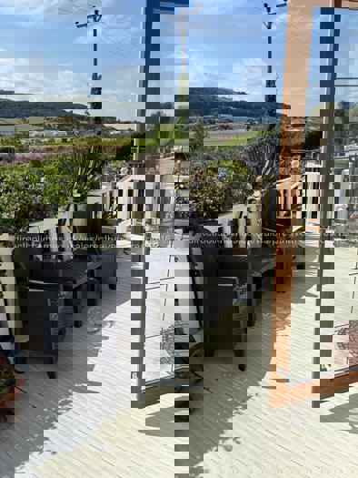 There are double doors into the lounge and onto the veranda and a wide access door. Outside in the garden the furniture makes it comfortable to sit out surrounded by shrubs and plants. There is a large wraparound veranda with a ramp making it accessible for wheelchair users.