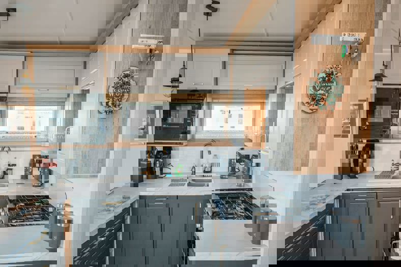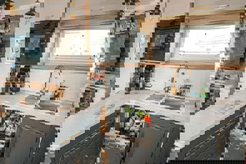 The open-plan living area comprises the fully equipped kitchen diner and lounge. Within the kitchen diner is a gas hob/oven, microwave, brand new (2025) air fryer, fridge-freezer, kettle and toaster, along with a dining table and four chairs. This leads to a homely and relaxing lounge with two comfortable sofas (one 4 seater and one 3 seater), a Smart TV, coffee table and electric fire.