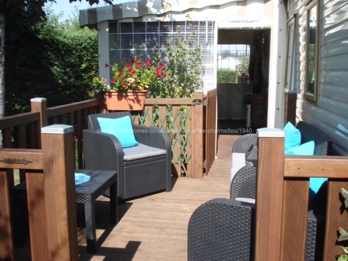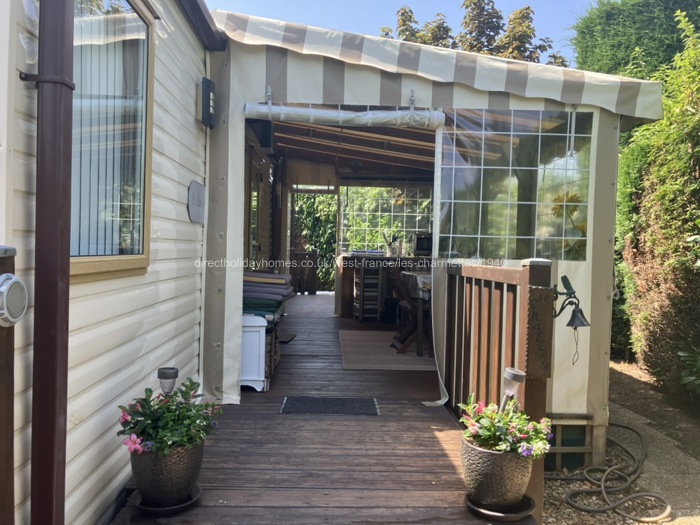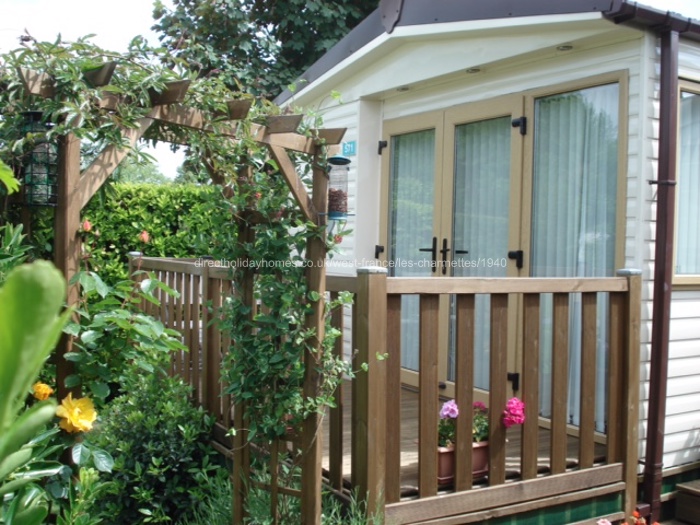Our mobile home benefits from a large open grassed area to the front which is perfect for children to play in. The plot is in a cul-de-sac and enjoys a lot of peace and privacy. It is in one of the original parts of Les Charmettes where mature trees, hedges and owners’ gardens give a wonderful ambiance. We think it is one of the best parts of the park just a 3 minute walk to the pools, resturant, bar and shop!
