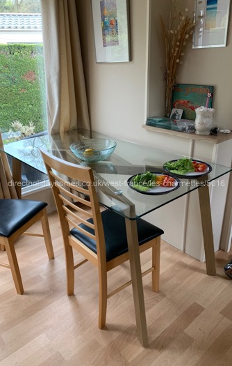The extra-spacious living area has double doors leading on to a large decked area spanning the full length of the home, widening at the rear to provide a lounge area with outdoor suite, coffee table and a large wooden dining table with six chairs which are shaded by two large parasols.