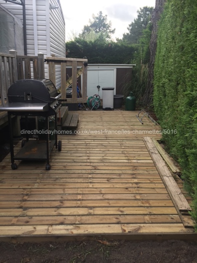 Steps at the rear of the deck lead down to a decked kitchen area with large Australian style BBQ, prep. table, an outdoor socket for portable induction hob when you really want to cook outside, and even a small herb garden. The grassed area has two trees to provide shade; a lovely spot to make use of the garden recliners.